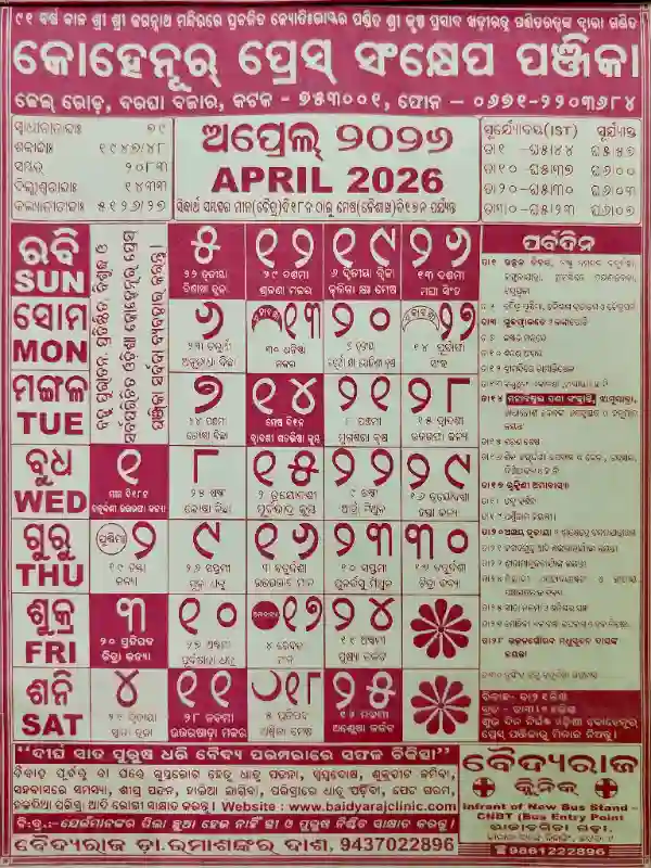The Odia Kohinoor Calendar for April 2026 marks a proud and auspicious month for Odisha. It