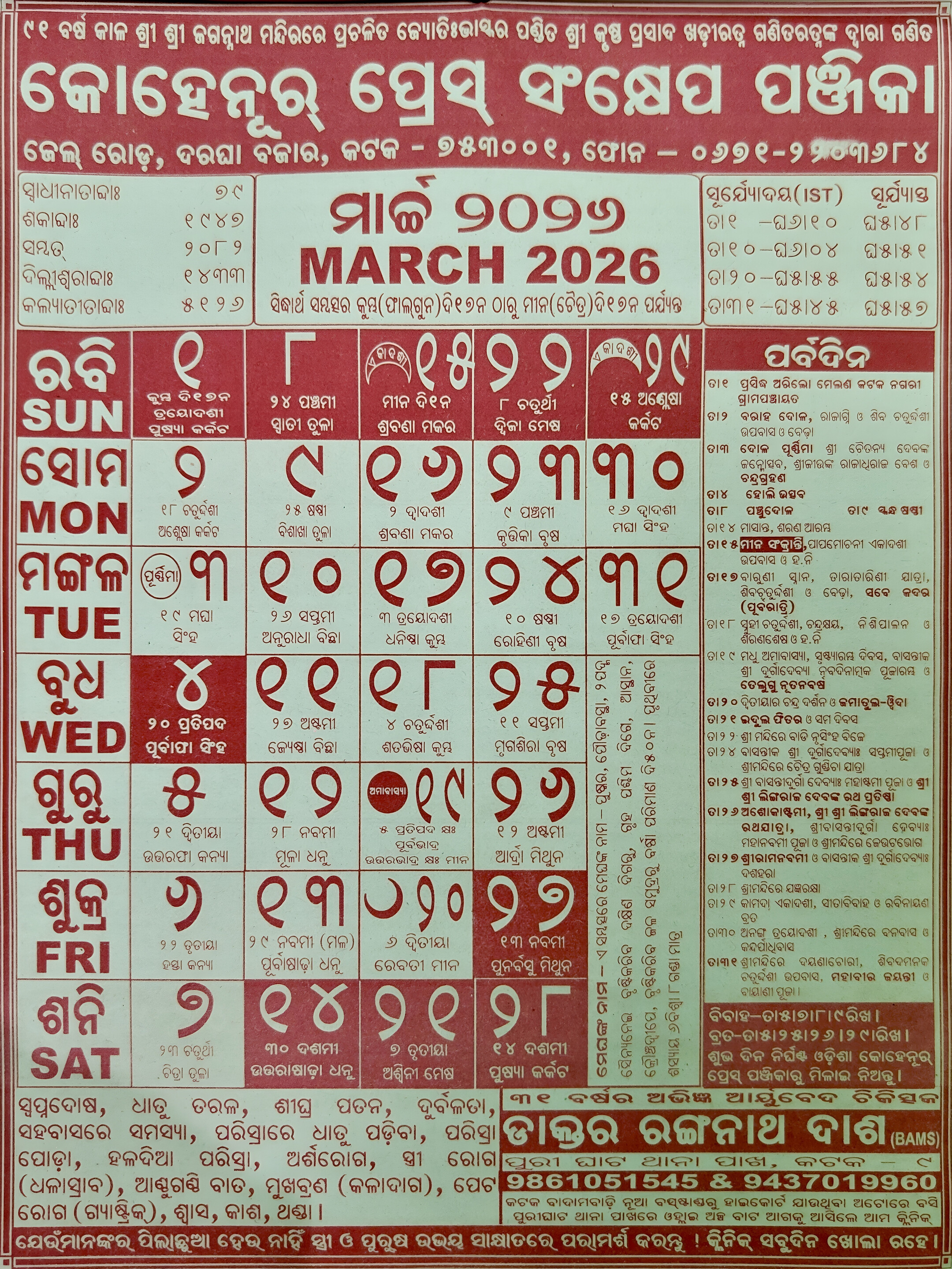 Detailed Insights: Odia Kohinoor Calendar March 2026