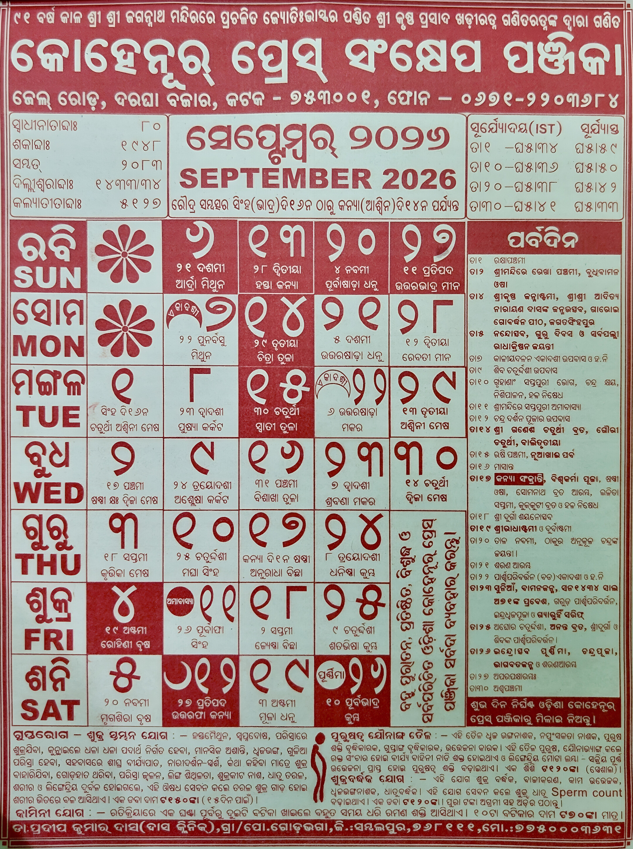 The Odia Kohinoor Calendar for September 2026 marks one of the most culturally